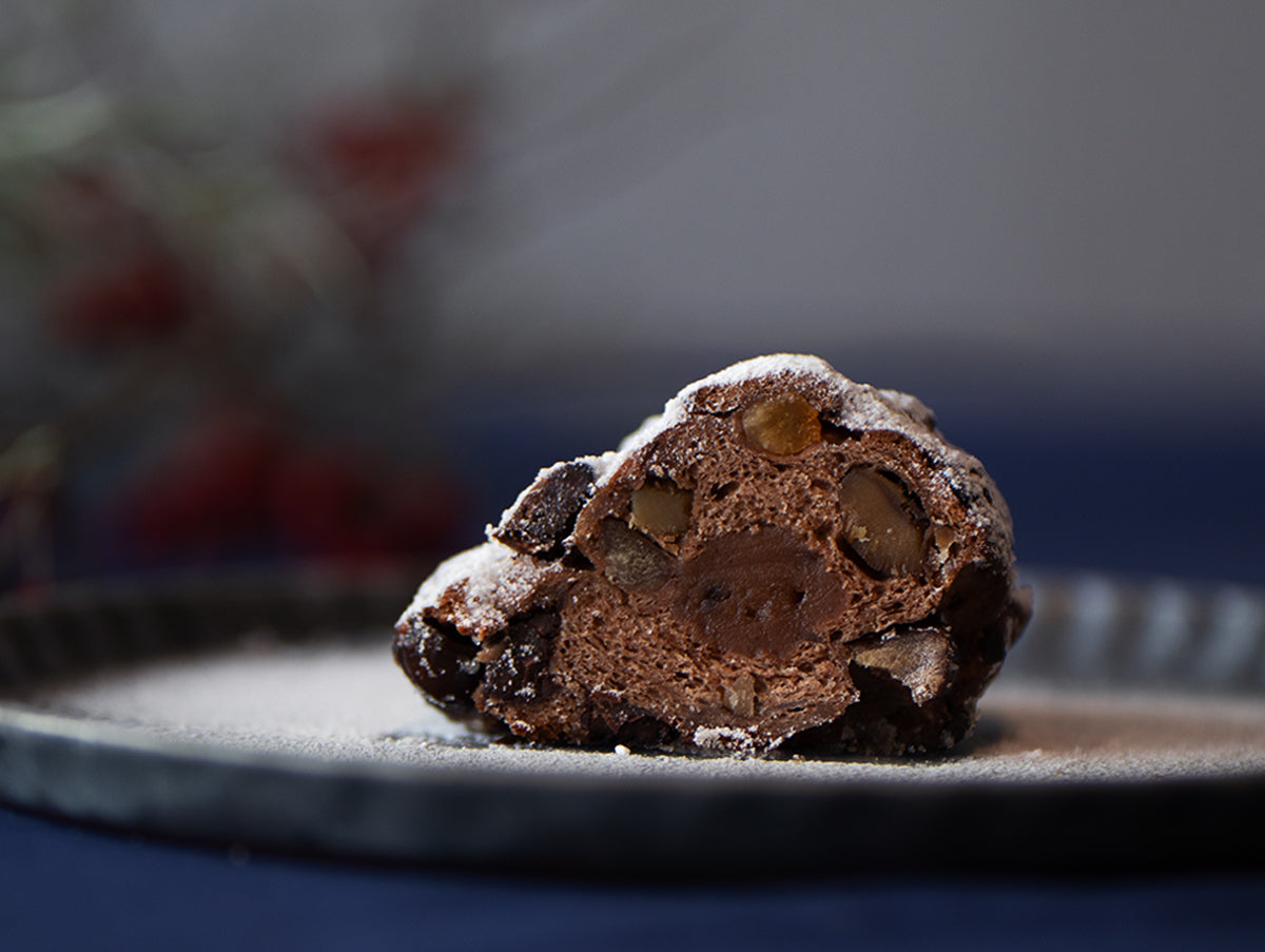 栗とチョコレートのこっくりとした甘さに、オレンジとラムの香りがふんわりと追いかけます。 ひと切れごとに、心がほどけるようなやさしい味わいのシュトーレンです。