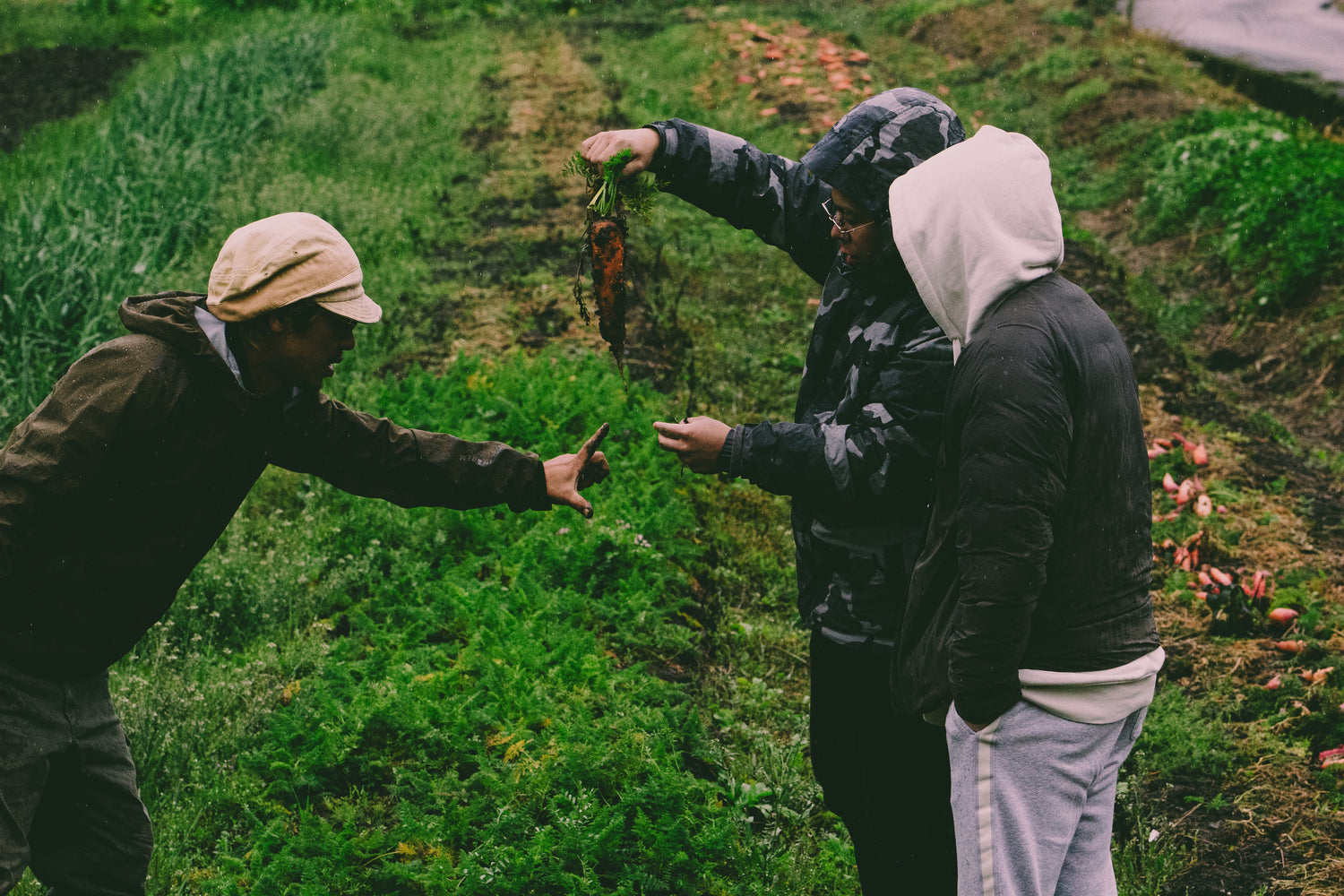 雨の中、三人の男たちが高知の畑で人参を掘り起こしました。滴る雨と共に広がるのは、割れた人参から立ち上る力強い香り。